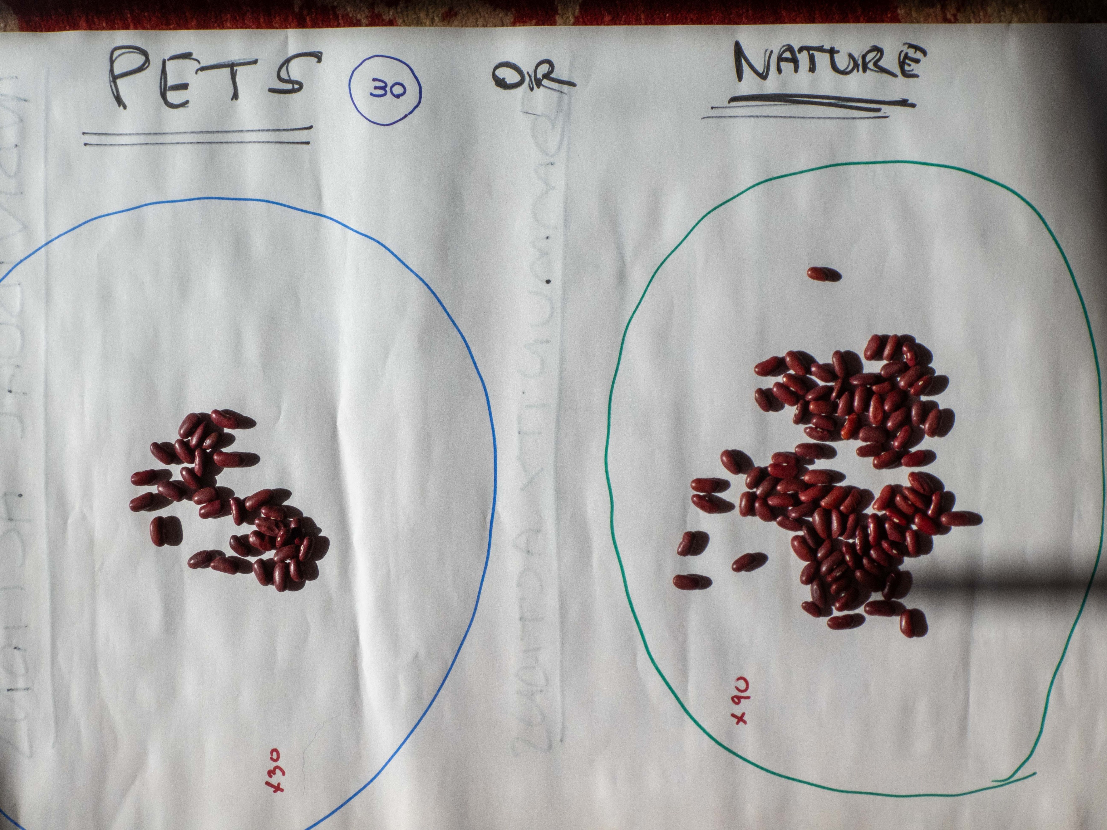 The balance between care for your pet and care for nature? Each participant was given ten kidney beans to distribute as they liked between two circles, one representing nature, one representing their pets.