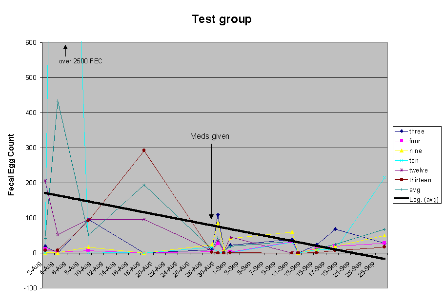 We also charted the average FEC for each group and calculate trendlines. Visually, it is obvious that the trendlines (log of the average FEC) on positive control and test group go in the negative direction, whereas the trendline on FEC of the negative control continues to increase. See attached charts at appendix.