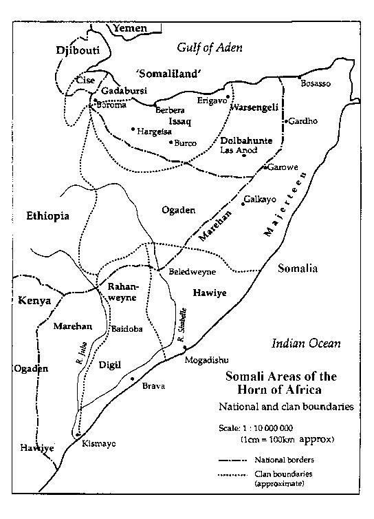 The Somali people occupy a huge part of the Horn of Africa stretching from northern Kenya, upwards through Somalia and eastern Ethiopia to Djibouti. They are a Hamitic people with a common language and ancestry dating back to AD 620 and Abu Ta’alib, the uncle of the prophet Mohamed. Somali society is organised into six clan families called the Dir, Isaaq, Darod, Hawiye, Digil and Rahanweyne. Each clan family is further divided into smaller groups such as clans and sub-clans which are highly organised social units.