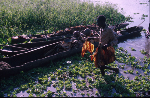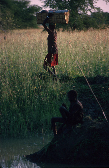 This dyke ran for several miles, keeping the flood waters away from a village. The flood waters are full of fish. The woman is moving between villages. A dieny is an all purpose basket, and is often used for carrying little babies, as well as fish, grain or other produce for bartering at the local market.
