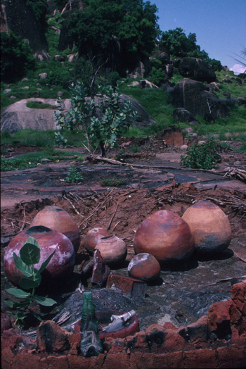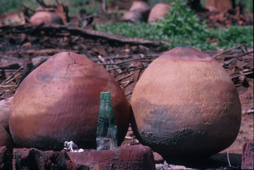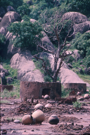 Water and grain storage pots are valuable possessions. People clearing up after the attack have collected the family pots together in the shells of the burnt out huts, ready for when the survivors return.